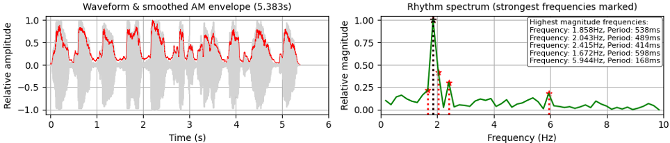 By using spectral analysis with a Fast Fourier transform, more precise results can be calculated: Figure 2 (right) shows that the main frequency peak is indeed found at about 1.858 Hz, exactly as measured by hand, with other frequencies surrounding the main frequency, due to irregularities in syllable structure and durations. Higher, weaker frequency peaks, most clearly at 5.944 Hz (period of 168 ms) also appear, also due to syllable components and their durations.