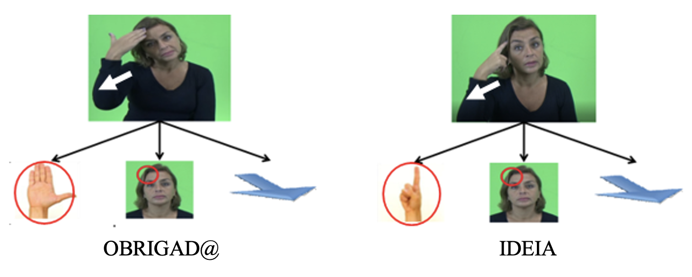 William Stokoe demonstrou, à luz da corrente estruturalista vigente em sua época, que a língua de sinais americana, ASL (do inglês American Sign Language) e, por extensão, todas as línguas sinalizadas são línguas naturais. Seu principal argumento se fundamentou no fato de que, assim como as línguas orais, as línguas de sinais são duplamente articuladas. Precisamente, Stokoe (1960) demonstrou que os itens lexicais da ASL, unidades significativas, são decomponíveis em unidades menores não significativas, mas distintivas de significado. Isso pode ser ilustrado por meio dos sinais da libras OBRIGAD@ e IDEIA (Figura 1). Observa-se pelas imagens que cada um deles é formado por uma configuração de mão, por um ponto de articulação e por um movimento. Observa-se também que os sinais em questão constituem um par mínimo, pois distinguem-se entre si unicamente em função das diferentes configurações de mão que apresentam. Com isso, Stokoe demonstra que as línguas de sinais podem ser analisadas fonologicamente.