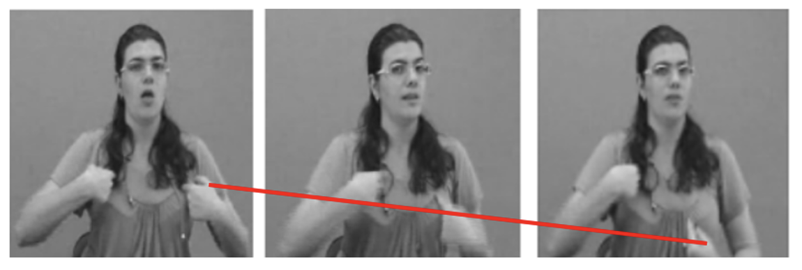 Por fim, Crasborn (2012) reporta a ocorrência de variação fonética no movimento e ilustra isso por meio de dados da língua de sinais holandesa, NGT (do holandês Nederlandse Gebarentaal). Segundo o autor, o movimento de um sinal, embora seja canonicamente articulado por meio de flexões, extensões ou rotações de uma ou mais articulações específicas da mão e/ou antebraço, ele pode variar e ser realizado por articulações mais próximas do tronco, proximalização, ou mais distantes, distalização (Figura 11).