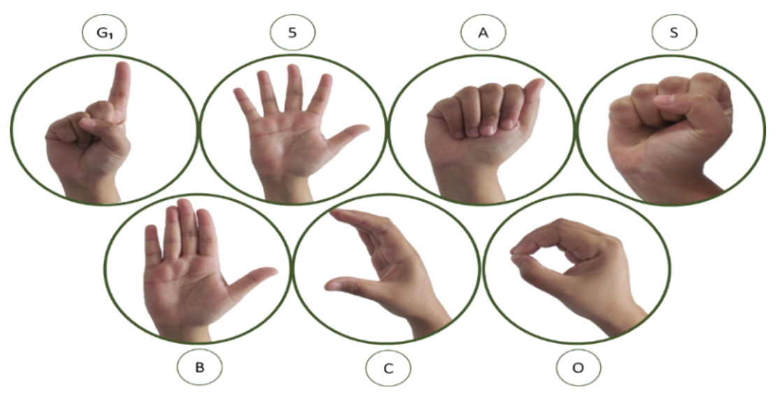 Segundo Battison (1978), as configurações de mão na ASL se distribuem em um continuum que vai das mais marcadas, ou seja, fonologicamente complexas, às não marcadas. O autor propõe sete configurações não-marcadas, a saber, G/1, 5, A, S, B, C e O (Figura 14), para essa língua e sustenta sua proposição em evidências de diferentes naturezas.