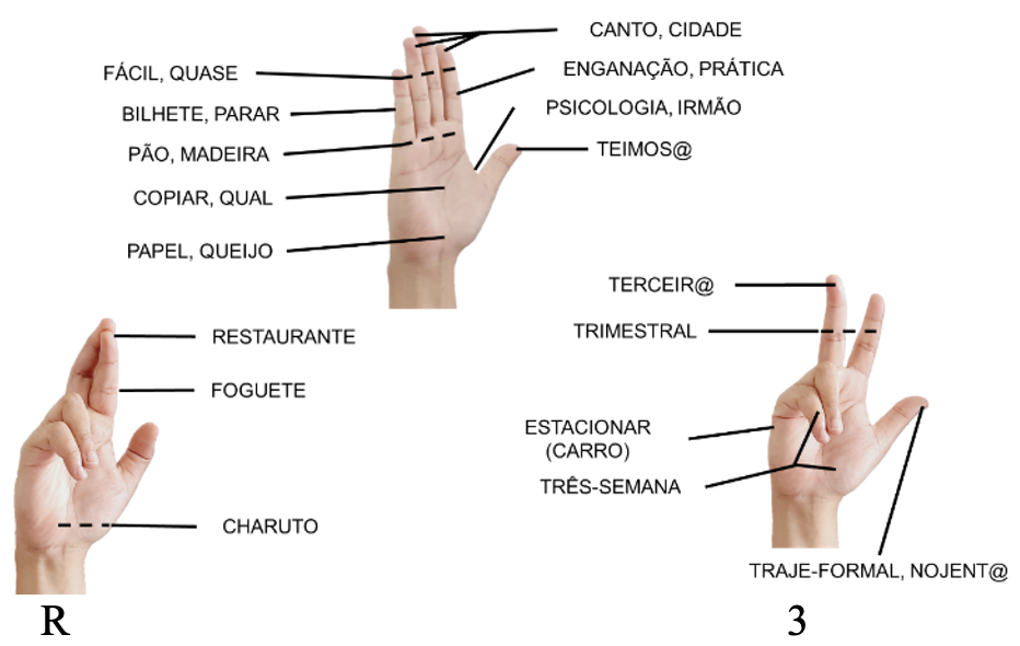 Como evidência adicional, Battison (1978) cita que configurações não marcadas são menos restritivas do que as mais marcadas em termos da interação com outros elementos dos sinais. Como sugere a Figura 15, comparativamente às configurações mais marcadas R (dedos indicador e médio cruzados) e 3 (polegar e dedos indicador e médio estendidos e demais flexionados), a configuração não-marcada em B apresenta uma maior variedade de pontos em que pode contactar o corpo ou a outra mão na formação de sinais. Em outras palavras, as configurações mais marcadas têm pontos de contato mais restritos, como se pode inferir pelo menor número de sinais associados a regiões em sua superfície em comparação à configuração B.