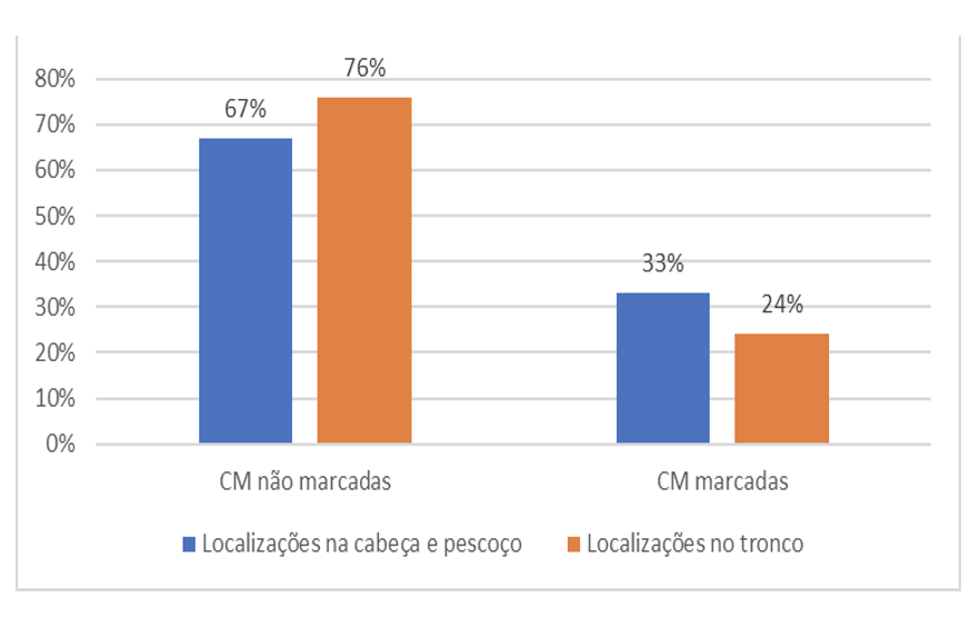 Com base no trabalho de Siple (1978) que propõe que na percepção da sinalização há uma região central, parte inferior da face, e outra periférica, que fica ao redor da central, Battison (1978) testou a distribuição de configurações marcadas e não-marcadas nessas duas regiões. Para isso, coletou sinais da ASL articulados próximo do corpo e sem contato do dicionário de Stokoe, Casterline e Croneberg (1965). Como mostra o gráfico na Figura 16, a porcentagem de configurações de mão (CM) não marcadas no tronco é maior em relação às marcadas nessa mesma região. Já em relação às configurações de mão (CM) marcadas, vê-se que estas são mais frequentes na cabeça do que no tronco. Isso corrobora o trabalho de Siple (1978), pois indica que áreas mais altas ou de maior acuidade visual no espaço de sinalização permitem configurações mais complexas, ao passo que regiões periféricas favorecem configurações não-marcadas, dado que estas são mais fáceis de serem percebidas.