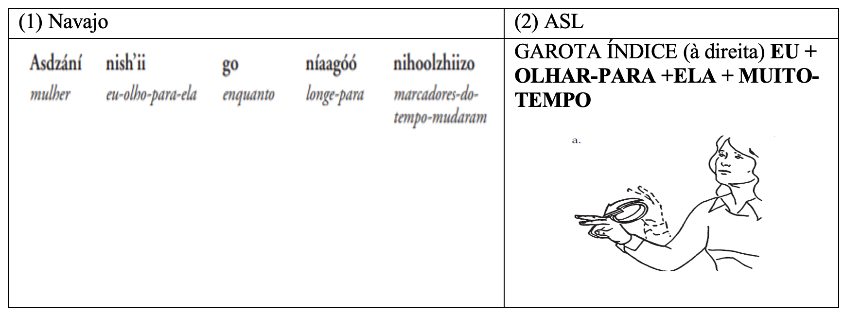 De acordo com Crasborn (2012), a percepção auditiva é muito mais apropriada para distinguir padrões temporais do que a percepção visual. Isso é, por vezes, correlacionado com a estrutura sequencial encontrada na fonologia e na morfologia das línguas faladas. O canal visual, por sua vez, tem grande capacidade de veicular informação simultânea. Isso pode explicar uma preferência por estruturas não sequenciais na fonologia e não-concatenativas na morfologia das línguas sinalizadas. Ilustro essas diferenças por meio do contraste feito por Wilcox e Wilcox (2005, p. 66) entre o navajo e a ASL. Conforme explicam os autores, uma frase como “eu olho para a garota por muito tempo” em navajo seria expressa por uma cadeia de morfemas produzidos linearmente (1), ao passo que em ASL quase todo esse enunciado pode ser expresso por um único sinal verbal, que por meio da sua direcionalidade indica seu sujeito e seu complemento e da forma e repetição do movimento, seu aspecto (2).