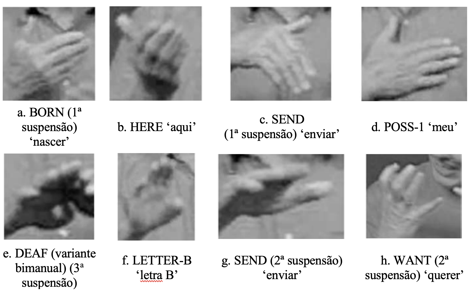 Os referidos autores acreditam que a variação na adução/abdução do dedo mínimo decorra do grau de flexão das articulações metacarpofalangeanas, MCF. Como evidência disso, eles apontam que o dedo mínimo estendido não ocorre nos exemplos da Figura 7a-c, em que a configuração de mão em B aparece flexionada nas articulações MCF, mas ocorre nos demais casos, em que essas mesmas articulações aparecem estendidas (Figura 7d-h).