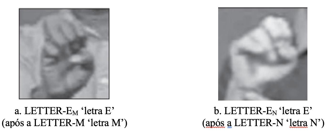 Johnson e Liddell (2012) observaram ainda que a variação na CM pode decorrer também da influência dos sinais adjacentes. Eles ilustram isso por meio da produção da letra manual E em dois contextos diferentes: seguindo a letra manual M[3] e seguindo a letra manual N[4] (Figura 8). Conforme se pode ver nas imagens, quando seguiu a letra manual M, a letra manual E foi produzida com dedos médio e anelar contactando o dorso do polegar e os dedos exibindo praticamente a mesma flexão em suas articulações. Diferentemente, quando seguiu a letra manual N, a letra manual E foi produzida com os dedos indicador e médio contactando o dorso do polegar e os dedos anelar e mínimo, não empregados na letra manual anterior, configurados diferentemente dos dedos indicador e médio.