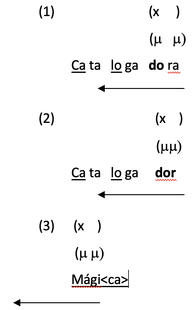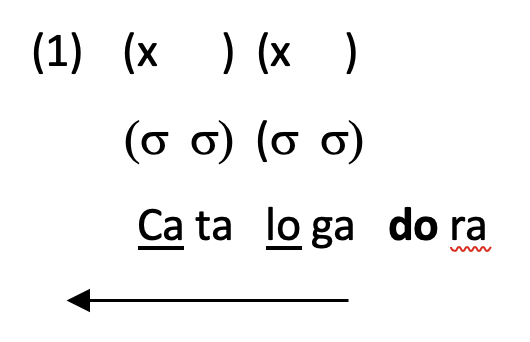 Para exemplificar uma análise vejamos a proposta de Harris (1989) para o espanhol. Harris, no quadro da Teoria Métrica, propõe uma análise para o espanhol em que proeminências secundárias são atribuídas pela construção de pés troqueus silábicos da direita para a esquerda, de modo iterativo, na cadeia das sílabas que precedem a sílaba portadora do acento primário. Esta análise é exemplificada em (1). Na palavra em (1), a proeminência primária está em negrito e a secundária, sublinhada. Na representação, os pés são marcados por parênteses e o “x” representa as proeminências atribuídas pela análise. Os símbolos “s” representam sílabas. O direcionamento é representado por uma flecha.