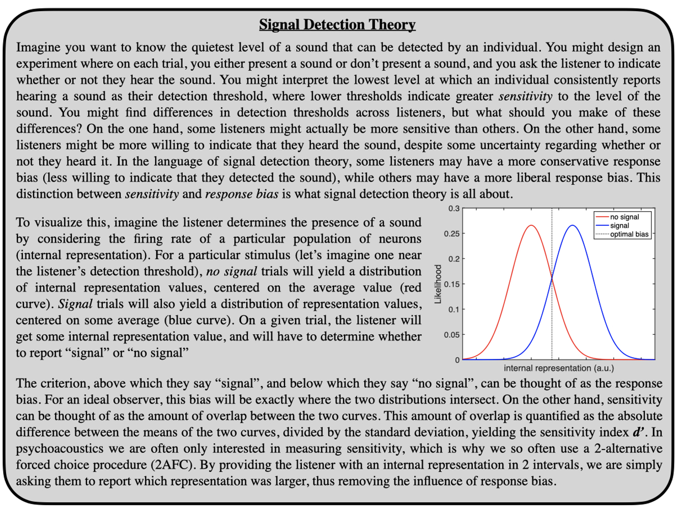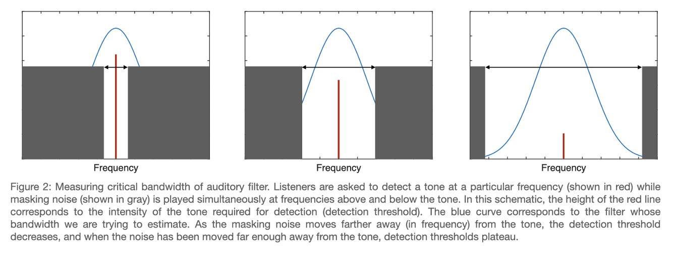To illustrate this controversy, we will consider a classic psychoacoustic method to determine the bandwidth of an auditory filter (critical bandwidth). Shown in Figure 2, auditory filter bandwidths are estimated by asking listeners to detect a tone in the presence of masking noise. Detection is measured using a 2-alternative forced choice procedure (see “Signal Detection Theory” box), where a stimulus is played sequentially in two intervals. While the masking noise is presented in both intervals, the target tone is only presented in one of these intervals, and the listener is asked to indicate which interval contained the tone. As the masking noise is moved farther away from the tone in frequency, the detection threshold for the tone decreases. This is because less noise is passing through the same filter that the tone is passing through. At a large enough separation, the noise no longer masks the tone at all, which means that the bandwidth of the filter is narrower than this separation.