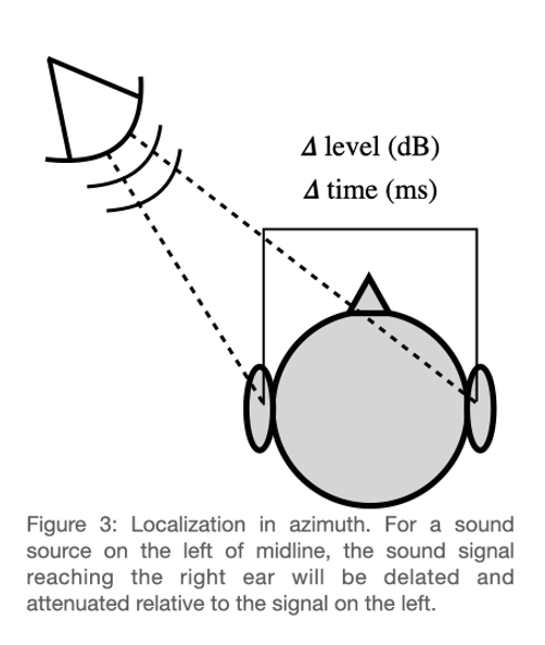 There are three dimensions along which a sound location can vary with respect to the head: left/right, up/down, and near/far. Our ability to localize along the left/right axis (azimuth) is supported by specialized brainstem nuclei that allow us to compare level differences and timing differences across ears. Interaural level differences (ILDs) arise from the fact that the head acts as filter. Imagine a sound source on your left. In order for that sound to reach your right ear, it must travel around your head. In so doing, the intensity of the signal is attenuated, particularly at high frequencies. This “low-pass” characteristic of the head (as filter) is exceedingly common in the natural world, where physical structures in general are more likely to attenuate high frequencies (though these structures also tend to have “resonant” frequencies). Interaural time differences (ITDs) arise from the fact that sound takes time to travel through a medium, and if one ear is closer to the sound source, the signal will arrive at the closer ear first. It is worth noting that the speed of sound is around 343 m/s in air (under standard humidity, temperature, and pressure) and the average human head is around 56 cm. This means that the difference in arrival time across ears is extremely small (< 1 ms), and specialized structures have evolved to compute such small ITDs. Unlike ILDs, which are larger and therefore more salient at high frequencies, ITDs are more salient at low frequencies. This is because at high frequencies, ITDs can become ambiguous. This perceptual result was established long before the underlying physiology was understood, and has to do with the fact that at high frequencies, multiple cycles of the stimulus occur in the time it takes to travel around the head. In other words, it is the interaural phase that is critical, at least for non-transient sounds. Indeed, when the initial onset cue has been experimentally controlled for, we refer to an interaural phase difference (IPD) rather than an ITD. While an involved discussion of “onset” vs “ongoing” ITD/IPDs is beyond the scope of this entry, suffice it to say that this is an active area of research. Like many active research areas in psychoacoustics, this area relies increasingly on our understanding of the physiology supporting the perception in question. As a brief example, it has been observed that ITD/IPDs at the onset of an otherwise unmodulated sound have an increased perceptual salience. This finding can be (mostly) accounted for by the fact that neurons “adapt” when responding to steady sound at a frequency to which the neuron responds. When this sound turns off, adaptation is released. Therefore when a sound turns on after being off, the quality of the neural representation is much better than when a sound has already been playing. This fact of physiology has particularly important consequences for binaural hearing, where a precise temporal representation can be critical for perception.