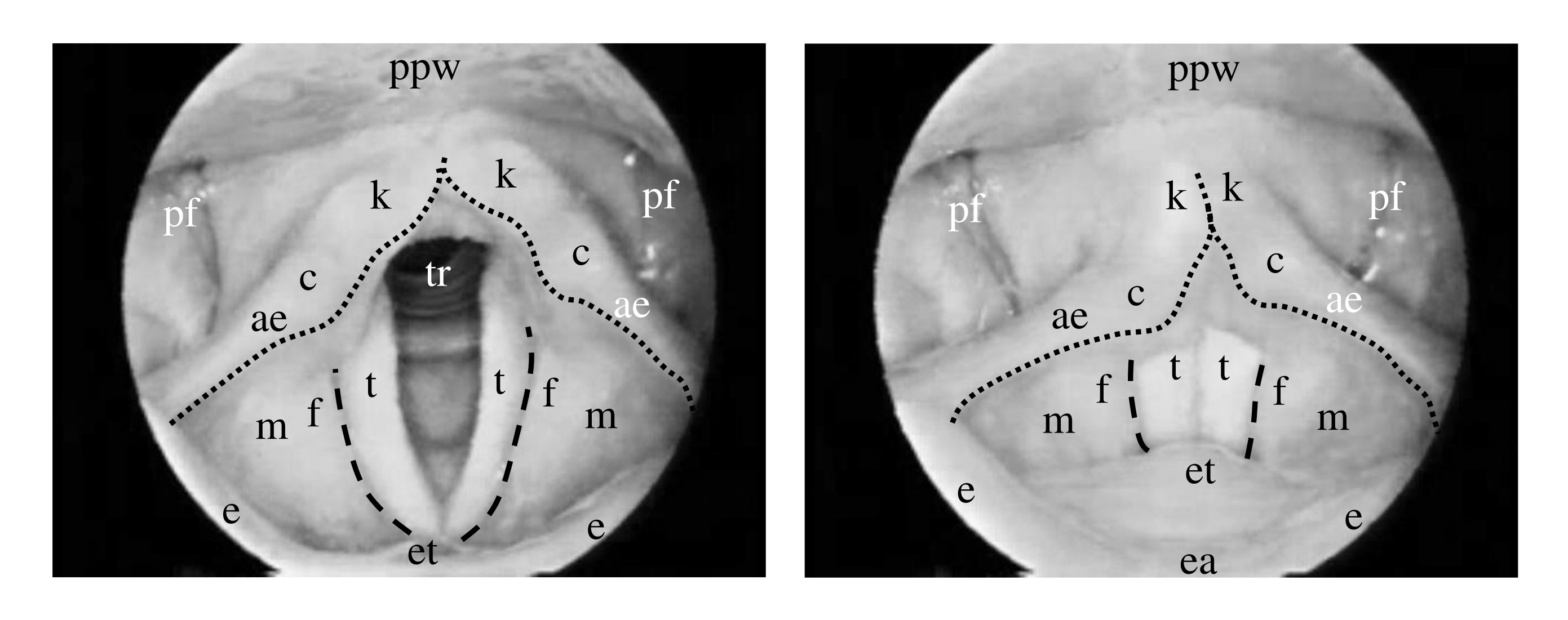 Figure 2. The laryngeal mechanism as viewed through a laryngoscope: on the left, in the state of ‘breath’ with the glottis slightly abducted; on the right, in the state of ‘voice’ with the vocal folds adducted and vibrating. tr=trachea, t=vocal (true) folds; the opening between the vocal folds above the trachea is the glottis; f=ventricular (false) folds, m=inner mucosa of the epilarynx, k=corniculate tubercles, c=cuneiform tubercles, ae=aryepiglottic folds, et=tubercle of epiglottis, e=epiglottis, ea=apex of epiglottis, pf=piriform fossae, ppw=posterior pharyngeal wall. Dashed lines = medial edge of ventricular folds; dotted lines = anterior edge of aryepiglottic folds (margin of upper epilarynx). Drawing from Esling et al. (2019: 39). Reproduced with permission of CUP through PLSclear.