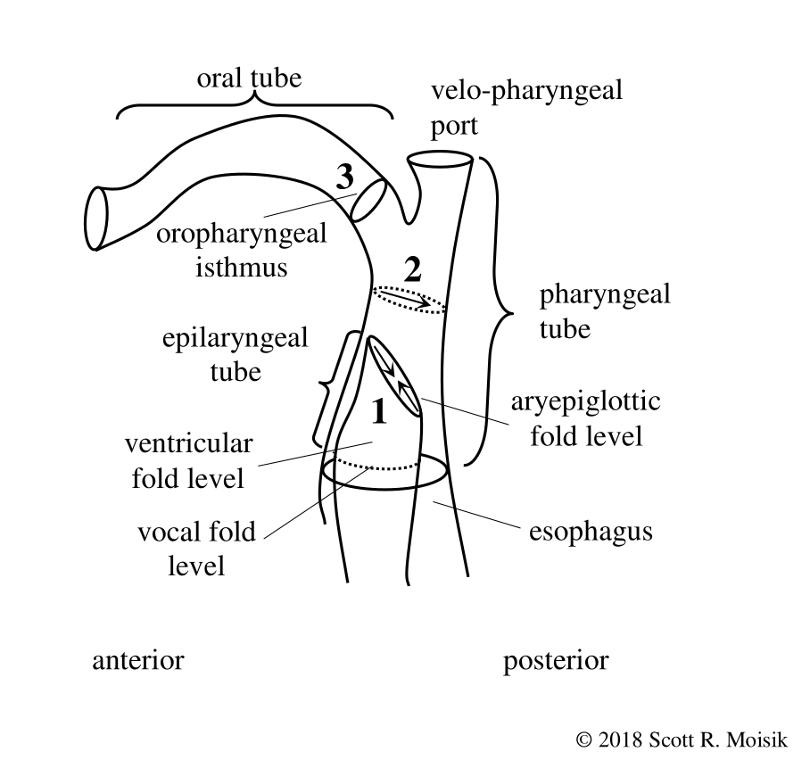 Figure 1. The laryngeal system at the bottom of the vocal tract. 1 = the epilaryngeal tube, with the glottis at its base and the aryepiglottic folds at its top (which is the level where laryngeal constriction is manipulated). 2 = the pharyngeal isthmus, which responds to laryngeal constriction and to vowel quality. 3 = the oropharyngeal isthmus or velic sphincter in the oral tract, which can serve as a measure of tongue raising and of the effects of laryngeal constriction in the context of different vowels. Drawing from Esling et al. (2019: 9). Reproduced with permission of CUP through PLSclear.