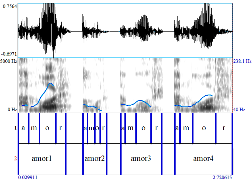 Ao compará-las do ponto de vista acústico, verificam-se diferenças em relação à duração das palavras e das sílabas que as constituem, entre a extensão, evolução e direção do contorno de F0 e da localização do pico de F0 em relação ao início, meio ou fim do núcleo vocálico da sílaba acentuada. Também podem ser inferidas diferenças quanto à realização do som de “r” (rótico) da palavra: vibrante e fricativo. O.detalhe fonético considerado em relação ao contexto linguístico: na primeira menção da palavra há uma pergunta que se subjacente: “O que é o amor”?; na segunda, a resposta assertiva; na terceira, a retomada da definição; e na quarta a retomada da pergunta.
