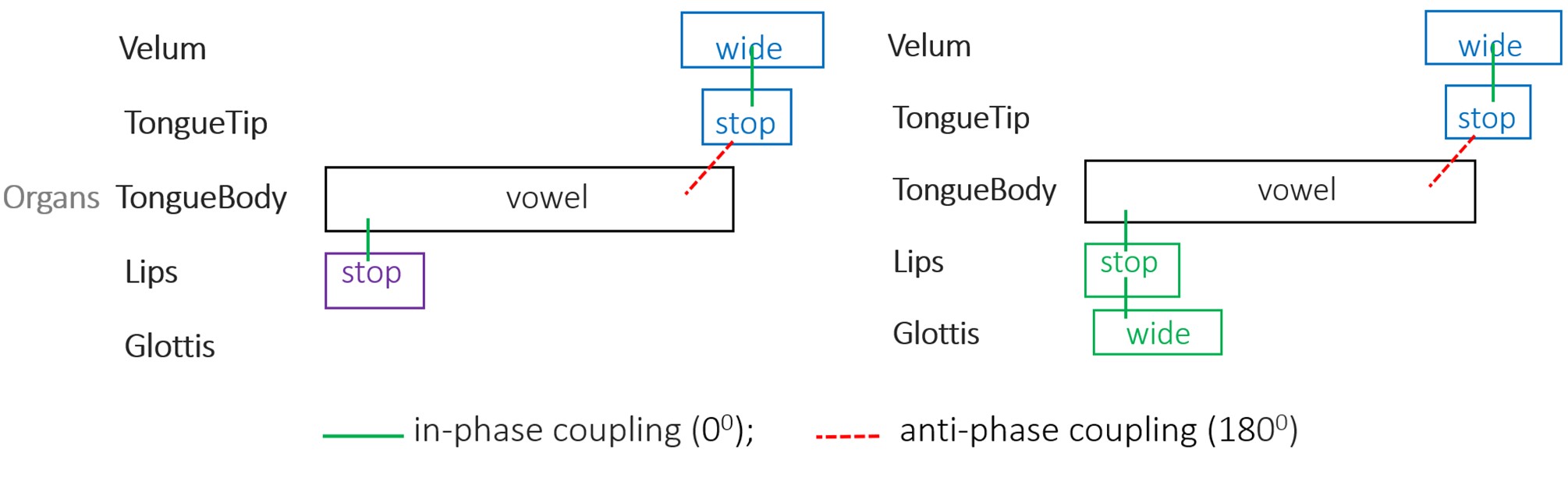 The Gestural Score, a theoretical representation, has been utilized to illustrate the gestural composition of a given utterance. It visually displays the coordinated structure of gestures as a function of time, as conceptualized within AP. Each gesture is depicted as a box, with the (horizontal) placement of these boxes determined by the coordination relations among the gestures. Figure 1 (left) presents the gestural score and the intergestural phasing relations for the English word ban /ban/. The onset C gesture (LIP for /b/) and the V gesture (TB for /a/) are in-phase coupled at 0 degrees, as indicated by a solid line, meaning that these two gestures are activated at roughly the same time. The coda consonant (/n/) consists of two gestures, the TT gesture and the Velum gesture, which are in-phase coupled with each other. Intergesturally, however, only the TT gesture is coupled with the V gesture (TB), and these are in a sequential relation, being anti-phase coupled (at 180 degrees), represented by the dotted line. The gestural score for the English word pan /pan/ (Figure 1 right) is nearly identical to that of ban, with the primary difference being that the onset C gesture is represented by a combination of the Glottis gesture and the LIP gesture, which are in-phase coupled.
