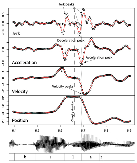 In Fig 2 we see the position signal (bottom curve) of an EMA sensor on the tongue tip of a Swedish speaker. The signal shows the sensor moving up/down during the word <bilar> (cars). As the speaker shapes the tongue tip constriction to produce /l/, the tip moves fast (a velocity peak marks the fastest moment) and then slows down rapidly (a deceleration peak). The tongue tip stays in position while forming a speech posture, changes direction somewhere mid-posture, and then moves rapidly away again (an acceleration peak, followed by another velocity peak). The jerk signal, on top in Fig 2, shows jerky movements in connection with the shaping of the speech posture.
