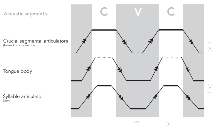 While the timing of deceleration and acceleration of the consonantal articulators determine the timing of segment boundaries, the same cannot be claimed for vowels. As proposed by Öhman in 1966, consonantal articulation is of an instantaneous nature, layered on top of the vowels. This has been further developed into various models, including the C/D model by Fujimura (2000), and Articulatory Phonology (AP) by Browman and Goldstein (1989) following work by Fowler (1986, 1996). In short, the idea behind this notion of overlapping gestures is that the consonantal gestures are separate in shape and structure from the vowels. Vowels consist of slower movements than the consonants, which are fast ballistic movements, and as a result end up as shorter than the vowels. Moreover, a consonant-vowel-consonant syllable (CVC) follows the timeline of the jaw cycle: a consonant at syllable onset takes place during the jaw opening, while a consonant in coda position takes place when the jaw closes. It’s reasonable to assume very different types of movements of the active articulator in concordance with the jaw opening (syllable onset) as opposed to the jaw closing (syllable coda), as starting positions and distance to target position would vary, affecting the trajectory and speed of the articulator, which calls for different articulatory strategies in onset and coda. However, irrespective of the underlying articulatory strategies, the consonants in a CVC syllable occur on either side of the vowel, hence, the resulting acoustic vowel segment is limited by when either of its neighboring consonantal constrictions are made.